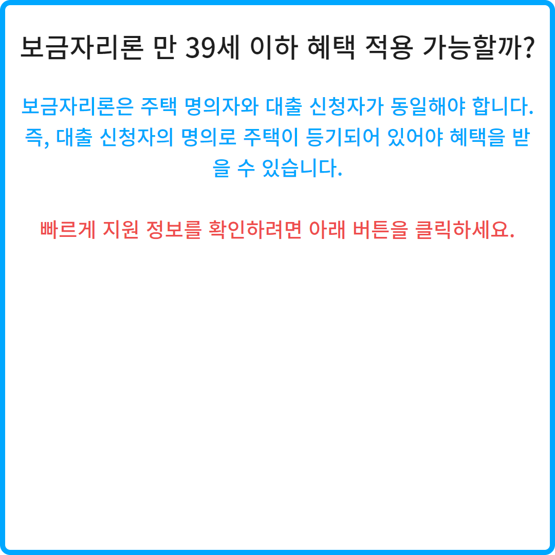 보금자리론은 주택 명의자와 대출 신청자가 동일해야 합니다. 즉, 대출 신청자의 명의로 주택이 등기되어 있어야 혜택을 받을 수 있습니다. 보금자리론 신청👆 디딤돌 대출👆 주택금융공사 금리비교👆