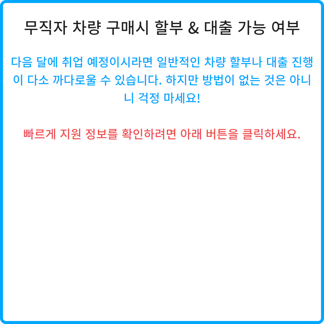 다음 달에 취업 예정이시라면 일반적인 차량 할부나 대출 진행이 다소 까다로울 수 있습니다. 하지만 방법이 없는 것은 아니니 걱정 마세요!